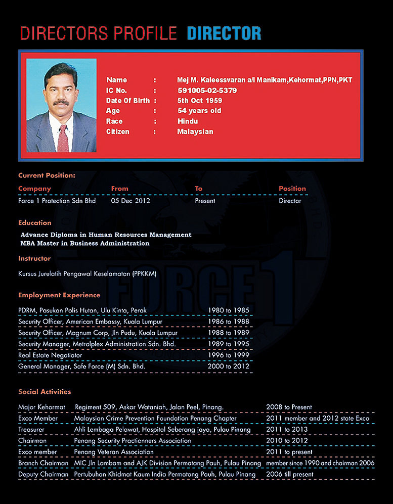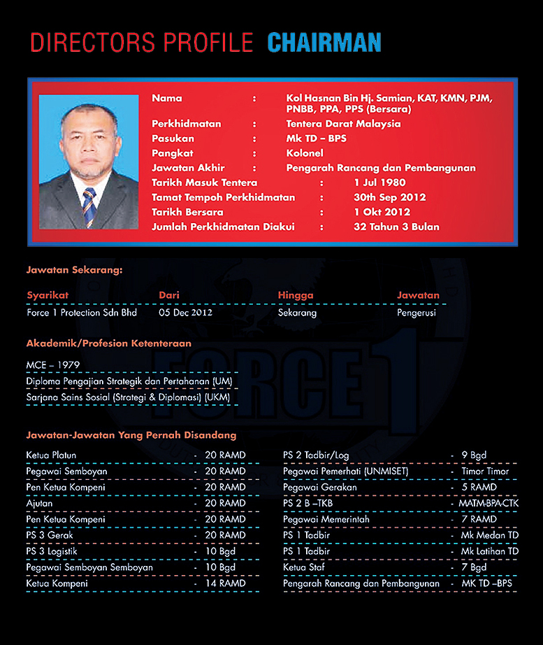 At the helm of this brand new organization is Colonel Hasnan Bin Hj. Samian who have served the Malaysian Armed Forces in various field for more than 30 years and Major (Hon.) M. Kaleessvaran a/l Manikam whereby the latter has over 30 years of practical working experience in this industry.